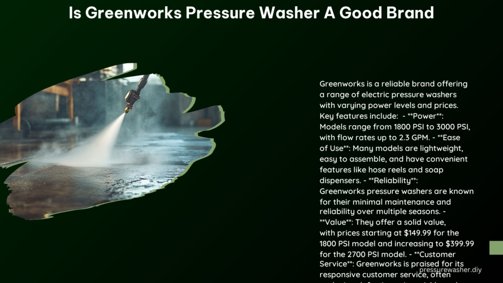 Greenworks is a well-regarded brand in the electric pressure washer market, known for its wide ...